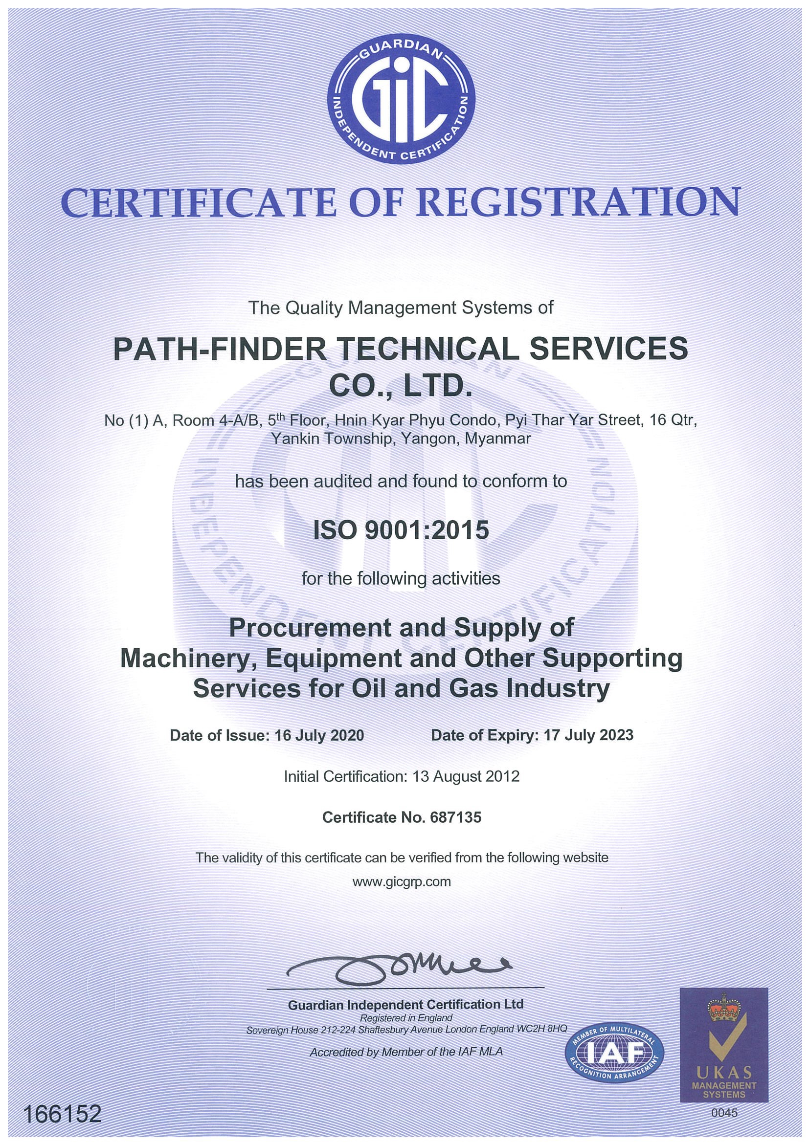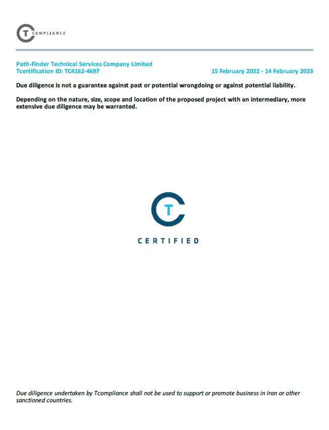 PATHFINDER-TECHNICAL SERVICES CO., LTD is a local service provider registered in Myanmar (Register No: 1781/2011-2012). We are certified with ISO 9001, 14001 and OHSAS 18001 for Quality Management System and Health, Safety and Environmental Management System. We are also certified with Trace certification for Anti-Bribery compliance. We are legal entity of Union of Myanmar Federation of Chambers of Commerce and Industry (UMFCCI Myanmar) and Ministry of Energy and Electricity (MOEE).